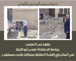 ⭕ كما تم التوجه لمنطقة محيط مسجد ألومنيوم الأهرام حيث تعانى المنطقة من مشكلة صرف صحى وانتشار اعمال فرز القمامة وانتشار مخلفات الفرز امان المسجد .. وقد باشرت رئيس الحى اعمال رفع القمامة وجون الفرز وكنس وتسوية الشارع وتسليك مطابق الصرف الصحى بخط الصرف بطلعت مصطفى .