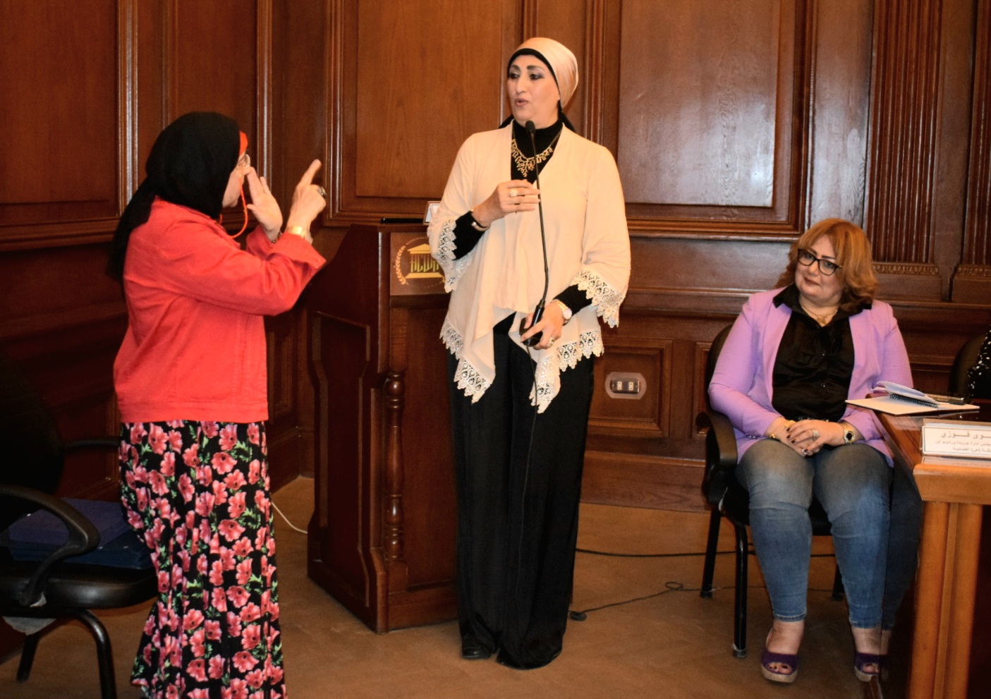 ثم قدمت للحضور إحدى السيدات المعاقين(حنان) سمعيا وبصريا وهي كانت جارتها في السكن، وكانت تستعين بها لترجمة حوارات من حولها أو البرامج التلفزيونية.. ومن هنا بدأت تدرس كيفية التعامل مع الصم والبكم حتى أتقنتها تماما وأصبحت دكتورة في ذلك المجال.