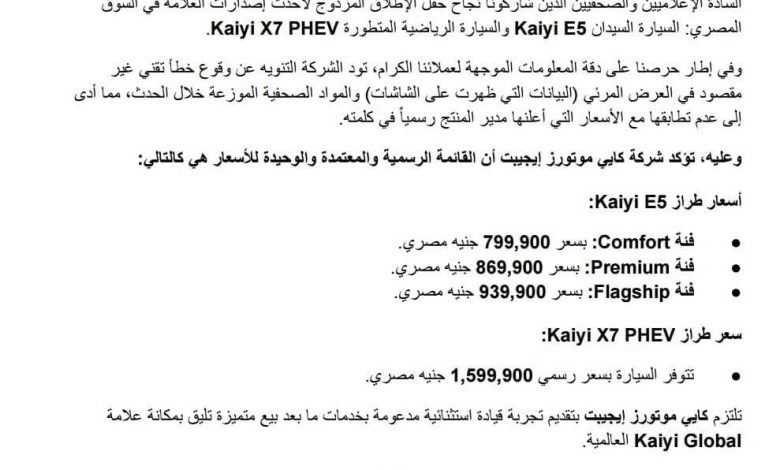 رسميا.. «كايي موتورز إيجيبت» تدشن «Kaiyi E5» في مصر بمواصفات متقدمة تراهن بها على صدارة المنافسة